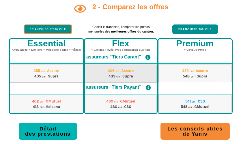 Le comparateur estime les budgets de 3 niveaux de prestations d’assurance maladie (Essential, Flex, Premium), selon la franchise choisie (de 300 francs à 2’500 francs) et le type de remboursement (tiers garant, tiers payant).